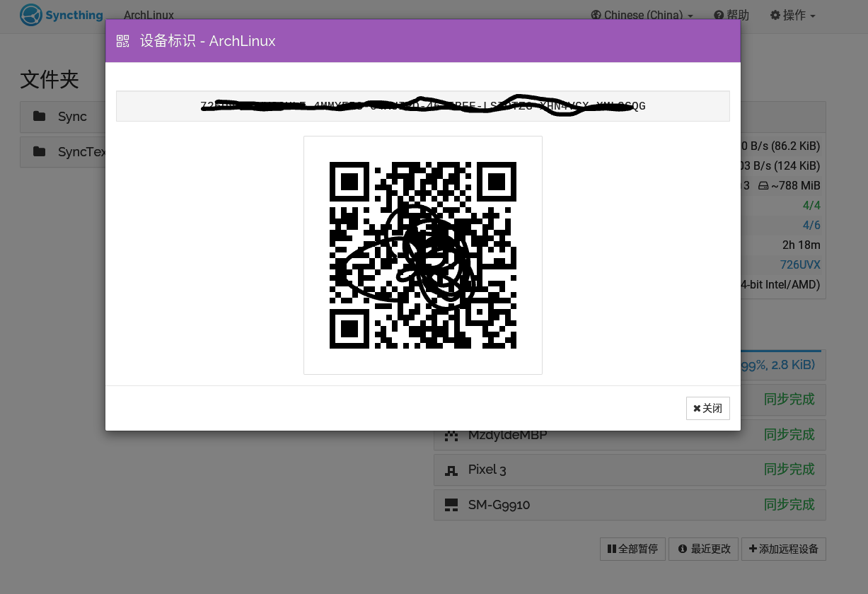 首先打开其中一个设备的 Syncthing 界面,并点击右上角操作 – 显示ID 获取设备 ID。再到另一个设备的 Syncthing 界面,点击右下角添加远程设备,输入需要同步的设备 ID
