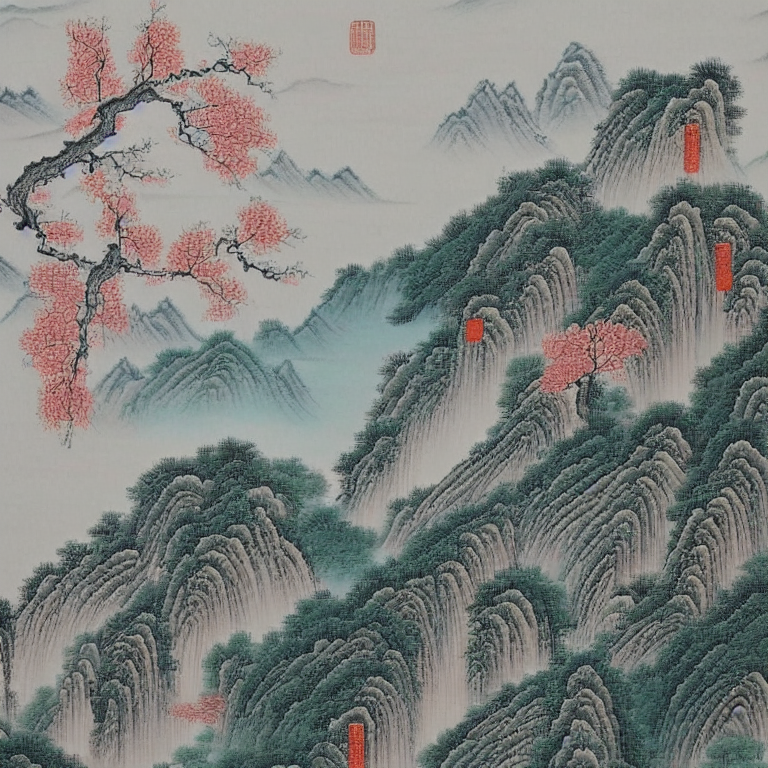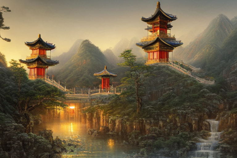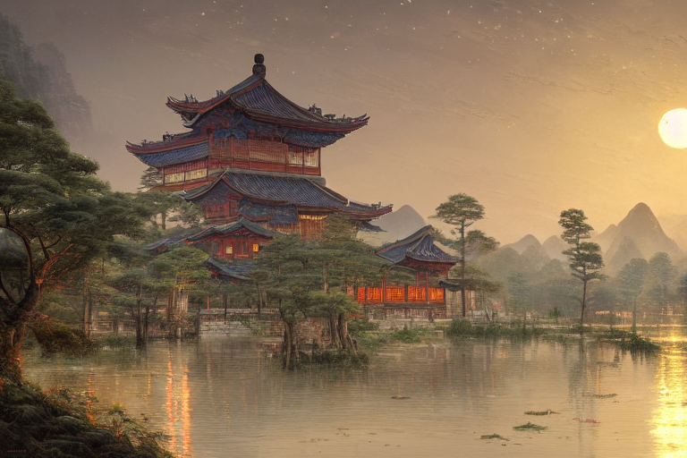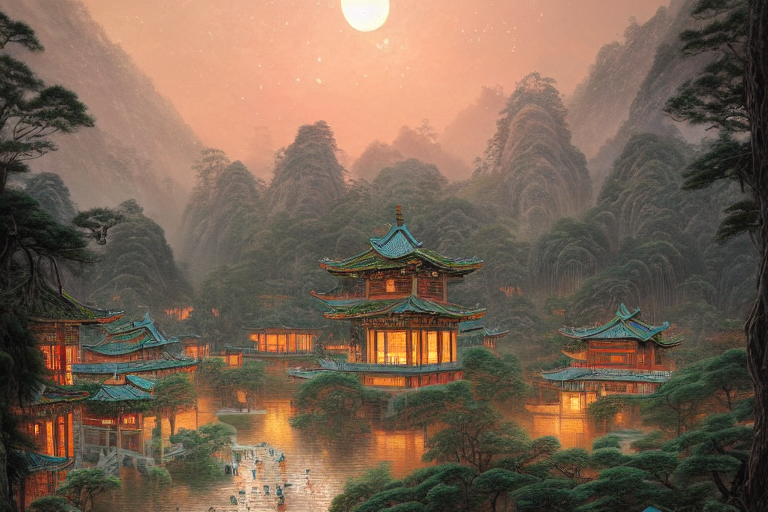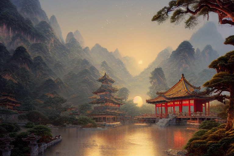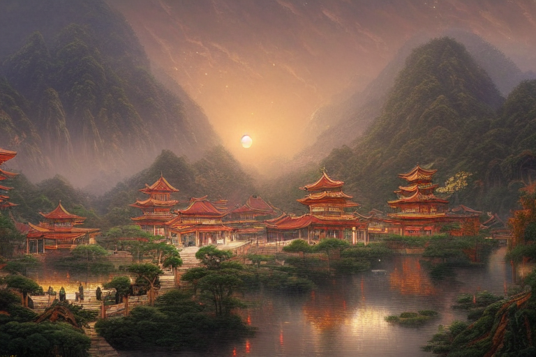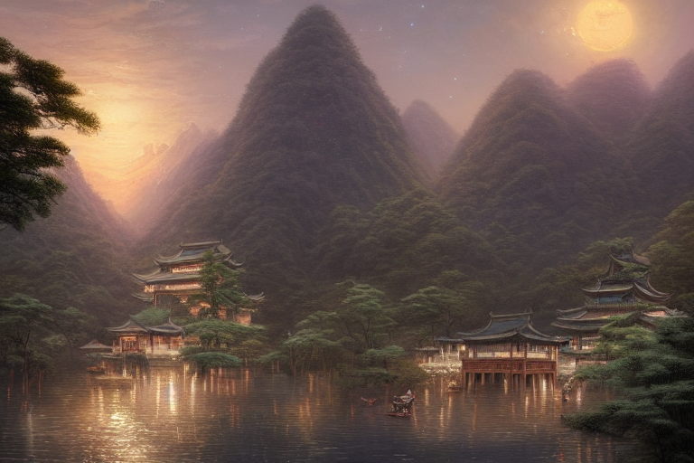A beautiful painting of Chinese-style ancient architecture city group built like a forest, at sunrise, Bright moonlight and stars, mountains and flowing water in the distance by greg rutkowski and thomas kinkade, Trending on artstation.